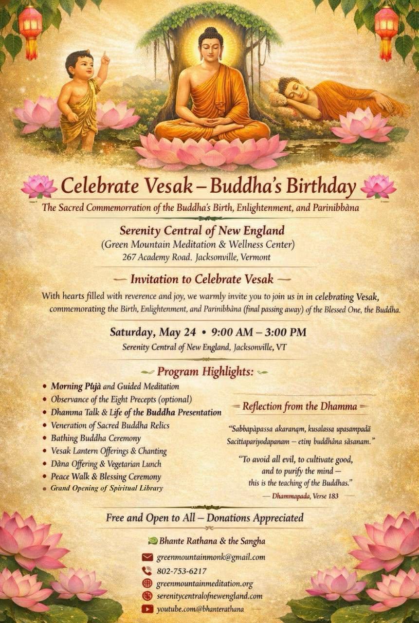 Join us at Serenity Central of New England and Green Mountain Meditation Center for a sacred and joyful celebration of Vesak, honoring the Birth, Enlightenment, and Parinibbāna of the Blessed One, the Buddha.